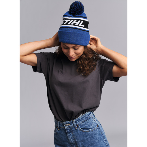 Poutavá čepice s velkým logem STIHL uprostřed a bambulí jako třešničkou na dortu.