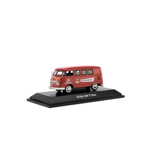 Kolekcionářský model ikonického VW T1 s historickým motivem STIHL. Materiál: litina z těžkého zinku, obarvená v historických odstínech. Umístěno na plastové základně a zakryto průhledným plastovým krytem od společnosti Schuco. Měřítko 1:43.