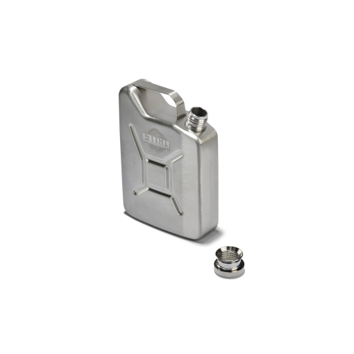 Ploskačka z nerezové oceli v podobě kanystru, ozdobená retro logem STIHL. Má kapacitu přibližně 125 ml kapaliny.